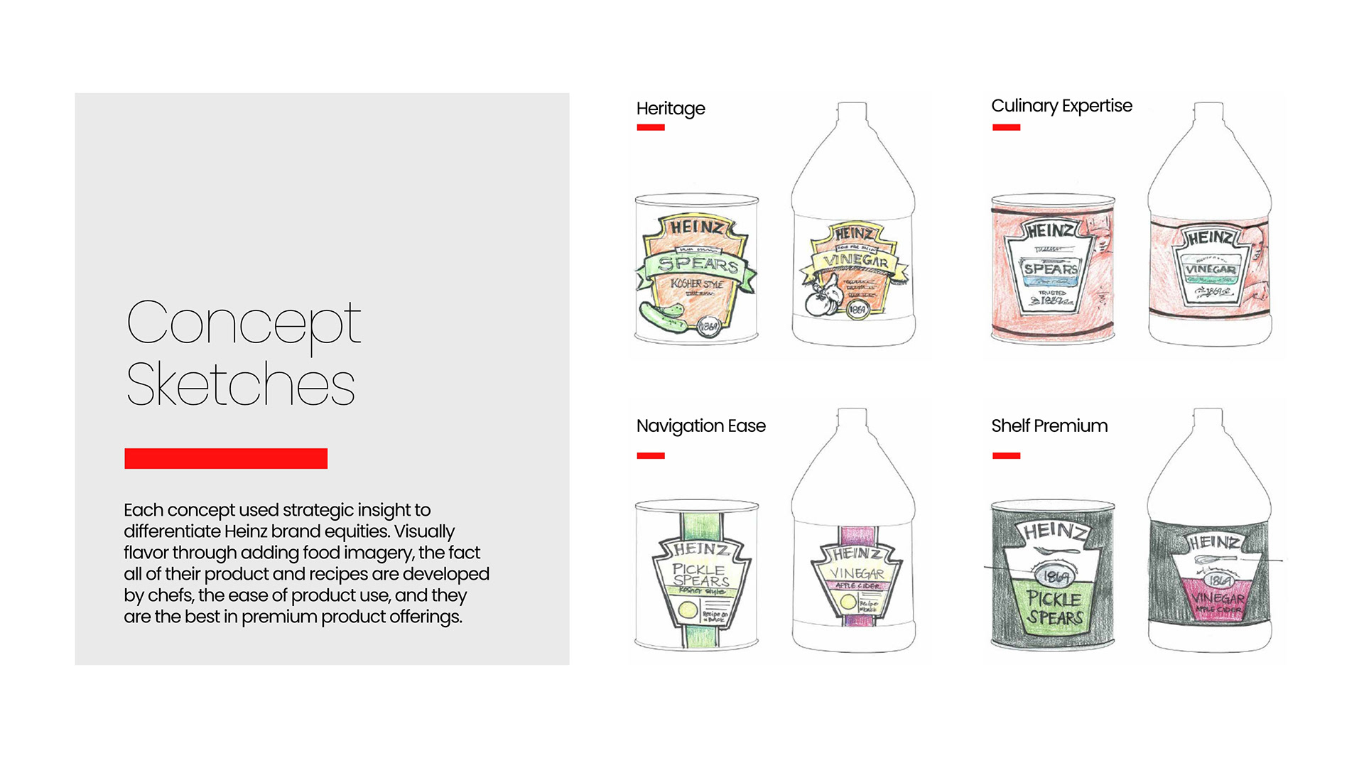Heinz Food Service was looking to redesign and create a brand architecture to increase differentiation and brand awareness in back of house for chefs. The redesign helped non-English speaking cooks easily identify products and was hugely successful and adapted to the way consumers at shelf now see the brand.